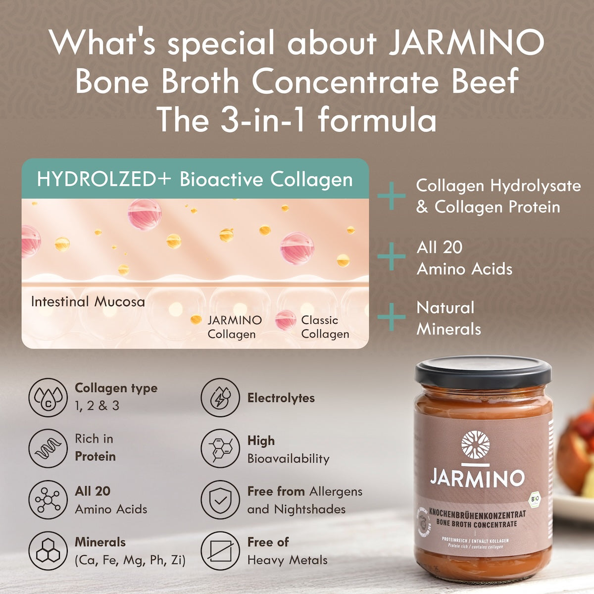 Where do the ingredients come from? We use only organic bones for our bone broth concentrate. Bottled in our manufactory in Bavaria, we source the bones from several farmers who practice sustainable agriculture. The animals are kept on pasture and are fed grass. Is the concentrate lead-free? Yes, regular laboratory tests prove that there is no lead in it. This is common for organic products. Is the bone broth concentrate free of histamine? Yes, the product is regularly tested, and no histamine could be detected. I case of any further questions, just send us an e-mail support@jarmino.co.uk. |